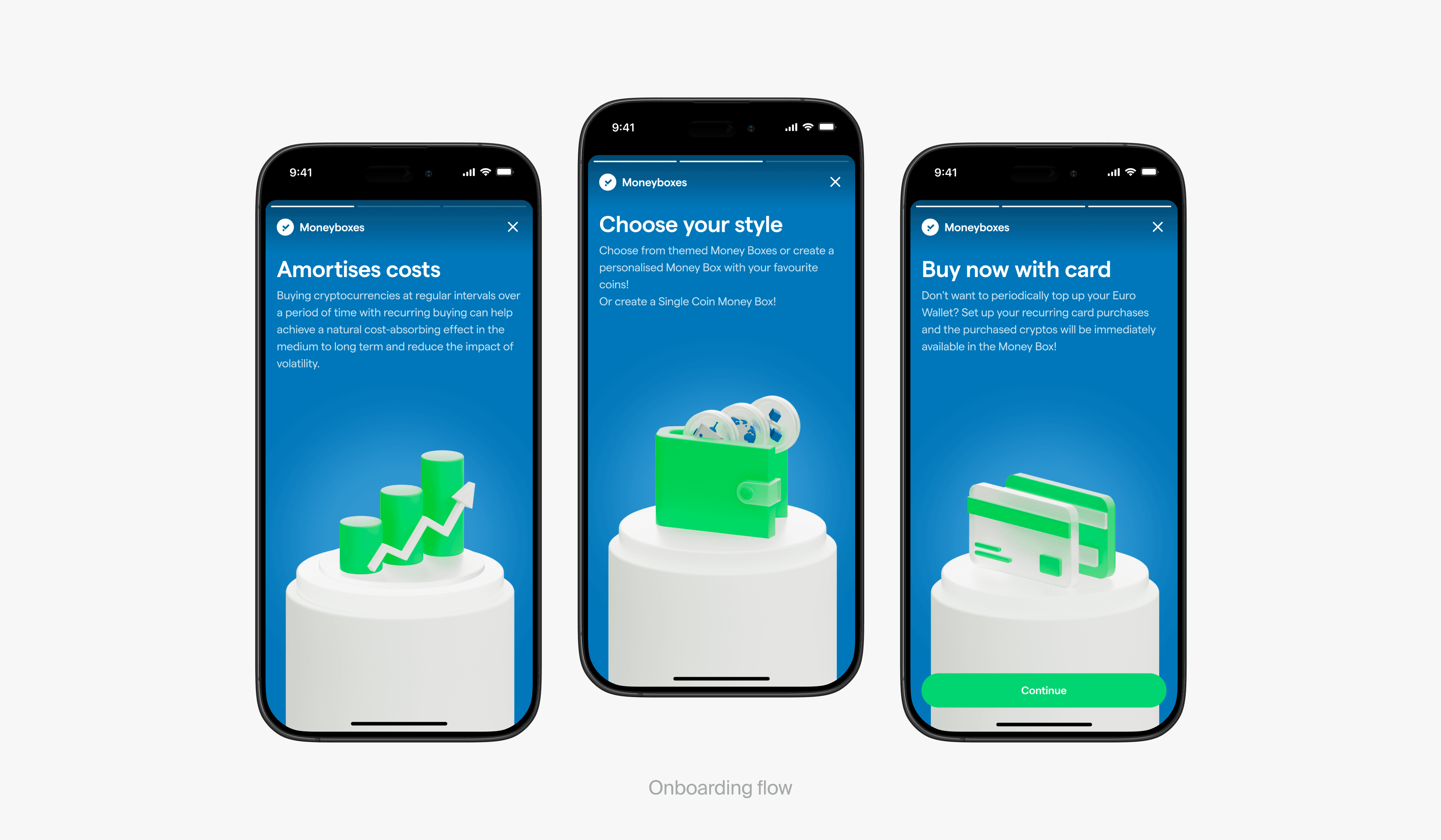 Using these insights, we rebuilt Moneyboxes as a guided experience. The new onboarding focused on why accumulation matters, while three Moneybox types: Curated, Custom, and Single Coin, let users choose their level of control. A clean, trustworthy visual language and progress tracking components turned abstract saving into something tangible.Delivery