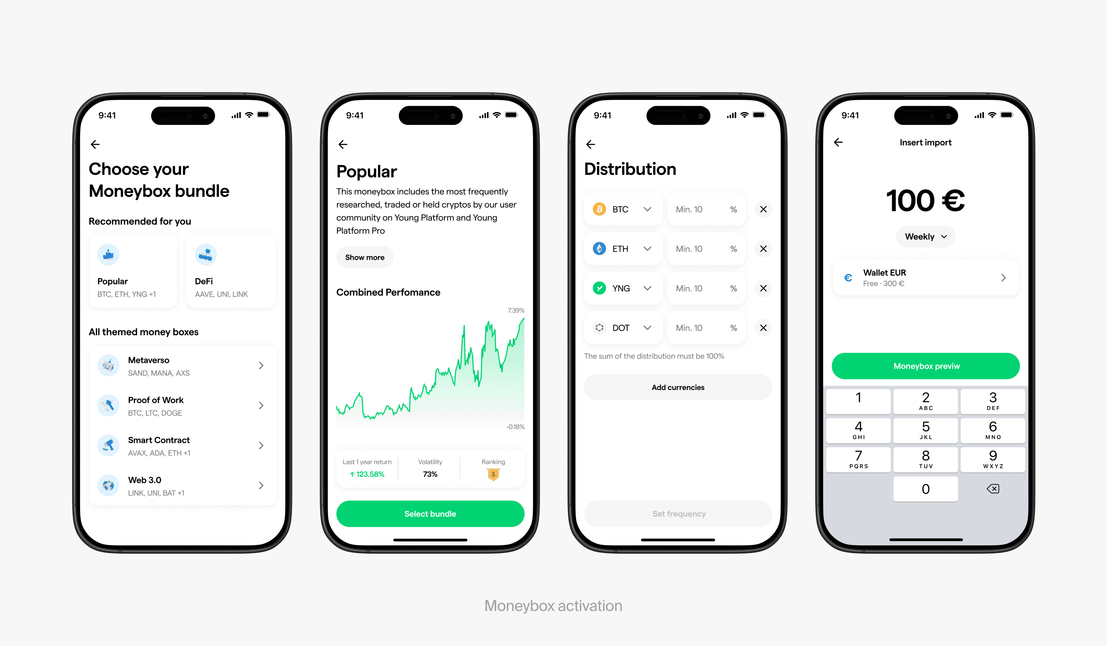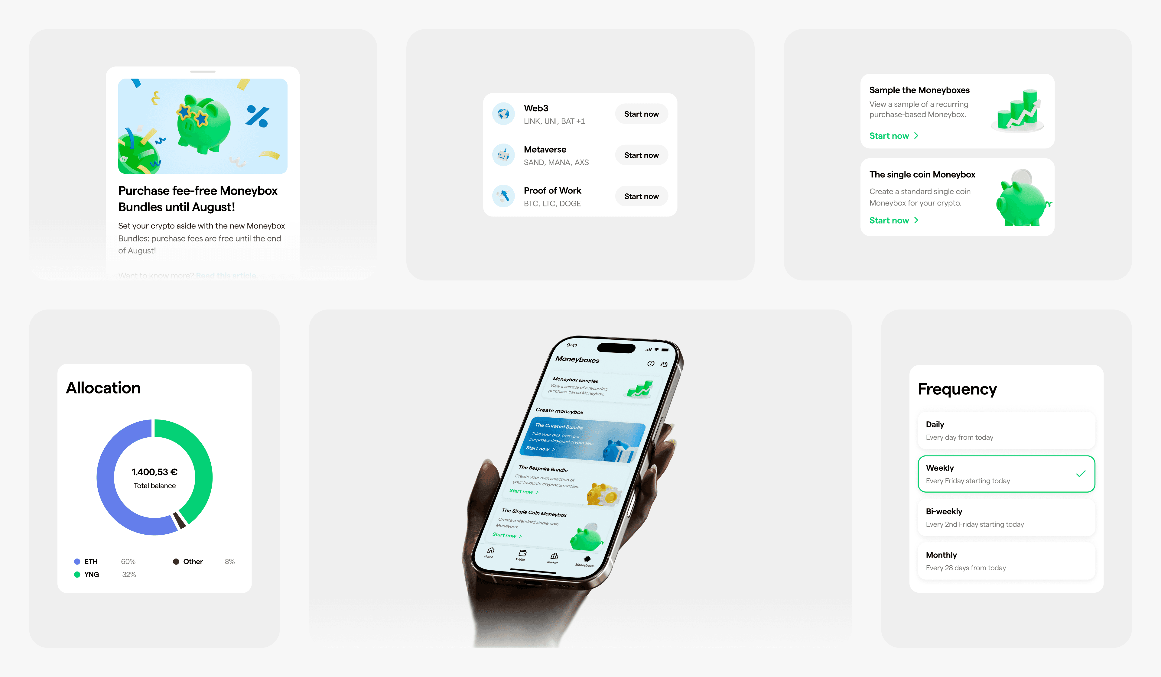 To support a healthier, more consistent investment behavior, we created Moneyboxes: a redesigned accumulation feature that lets users spread recurring purchases over multiple cryptocurrencies, building diversified portfolios effortlessly.