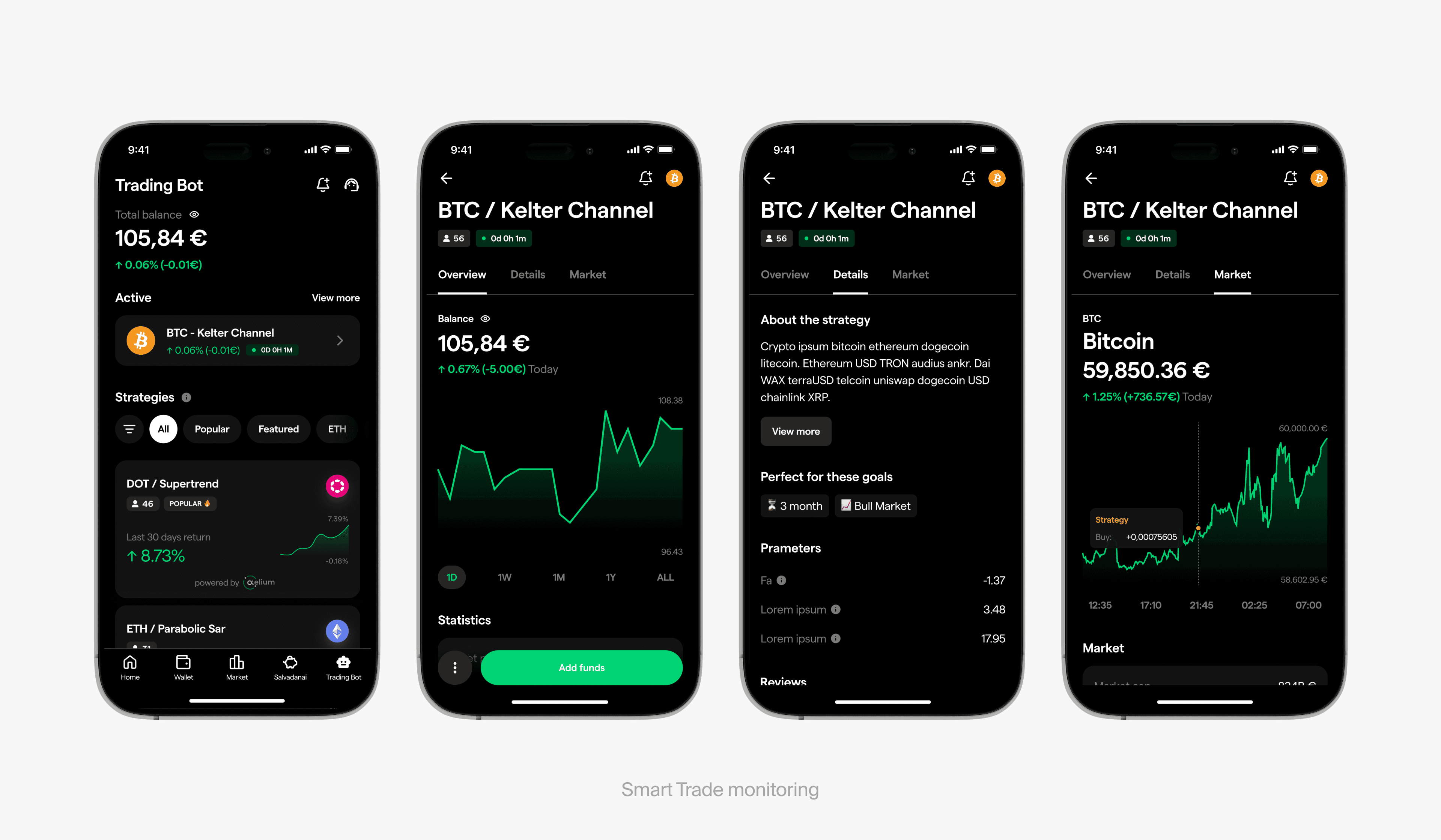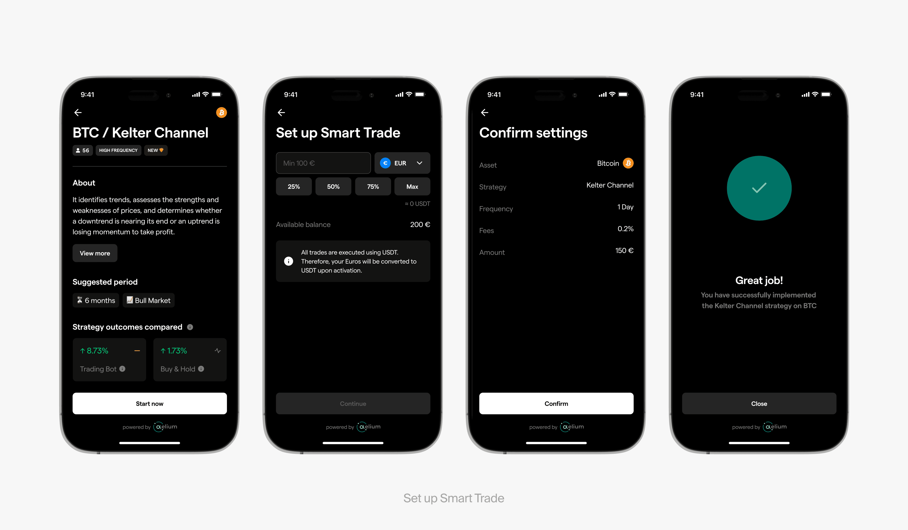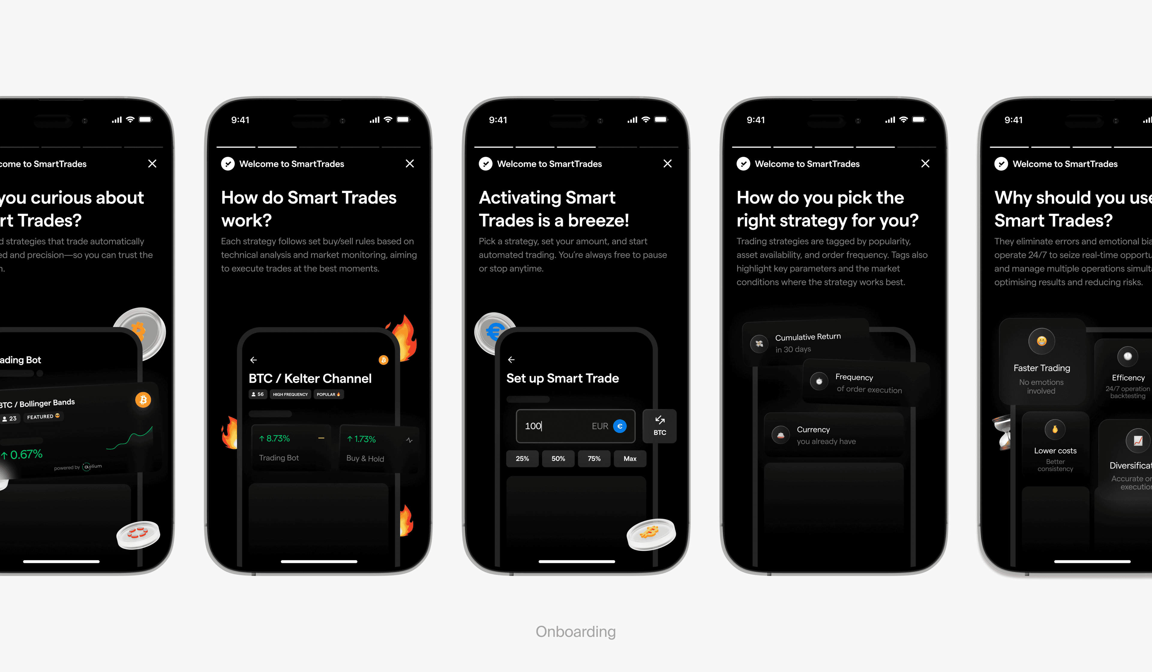 Smart Trades was launched iteratively, allowing us to learn and adjust as users interacted with the feature in real conditions. We integrated the partner’s strategy engine into our design system and introduced new components for strategy cards, alerts, and state feedback. Special attention was given to onboarding, which walked users through their first Smart Trade as if a mentor were guiding them.